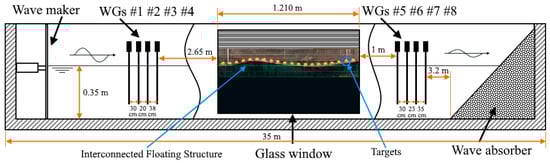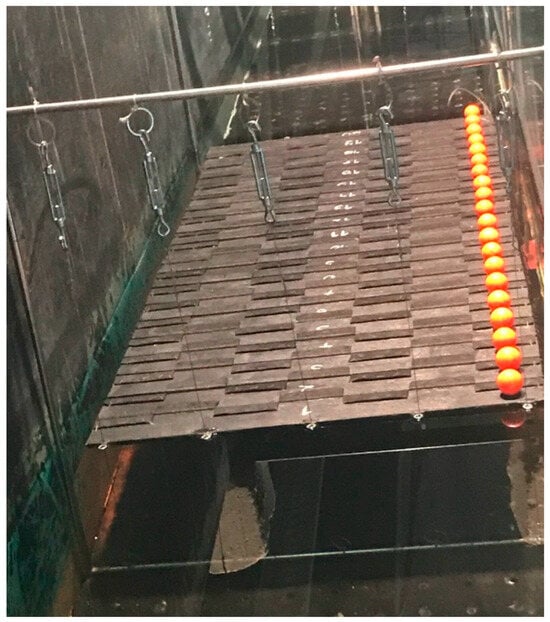 The model depicted in Figure 3 (showing a top view of the 20 hinged plates in a wave tank) is designed to exhibit geometric, Froude, and Cauchy similarities with the 1:57 scale model [46]. To attain elastic similarity, flexible EVA was selected as an appropriate material due to its elastic modulus (about E = 3 × N/m2), which effectively mimics the actual scale articulations.