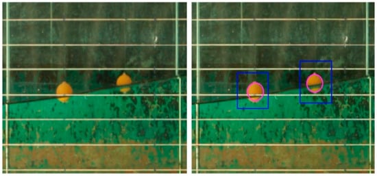 Using Python 3.9, the algorithms for tracking and identification in video frame image processing have been developed based on the OpenCV 4.5.0 library. Every test’s video is analysed by evaluating each frame as an individual image (Figure 4). In every one of those frames, predetermined areas are chosen for tracking by the algorithm, and within these areas (represented by blue rectangles), the target is located by filtering the image’s colours. This filtering process can isolate specific areas of the image that fall within a selected range of shades of a particular colour, like the orange selected for the targeted elements.