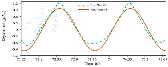 Comparison between numerical simulation and experimental data sets [34] of the structural vertical displacement for 5th plate versus time with and .