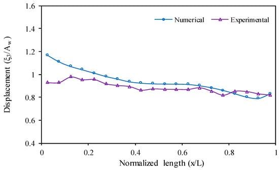 Figure 6 compares the current numerical and experimental results for the vertical displacement (considered at the point mass of each plate) of the interconnected structure normalized by the wave amplitude of the structure model across the normalized structural length (x/L). The overall trend of both numerical and experimental results is similar; nonetheless, there are certain distinctions between the two outcomes, particularly for the first plates in the numerical analysis in which the result shows higher displacement than the experiment with an overall relative difference between the numerical result and the experiment result in vertical displacement. Moreover, in Figure 6, the maximum displacement difference is noticed at the first plate, where the displacement from the experiment is 0.93 m, while the numerical model is observed at 1.16 m, which is 19.83% lower.