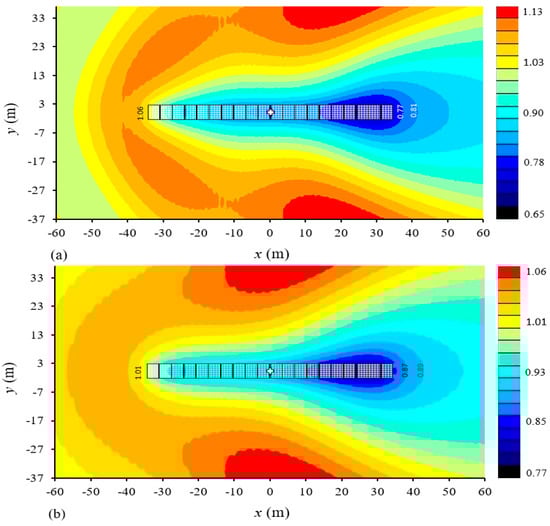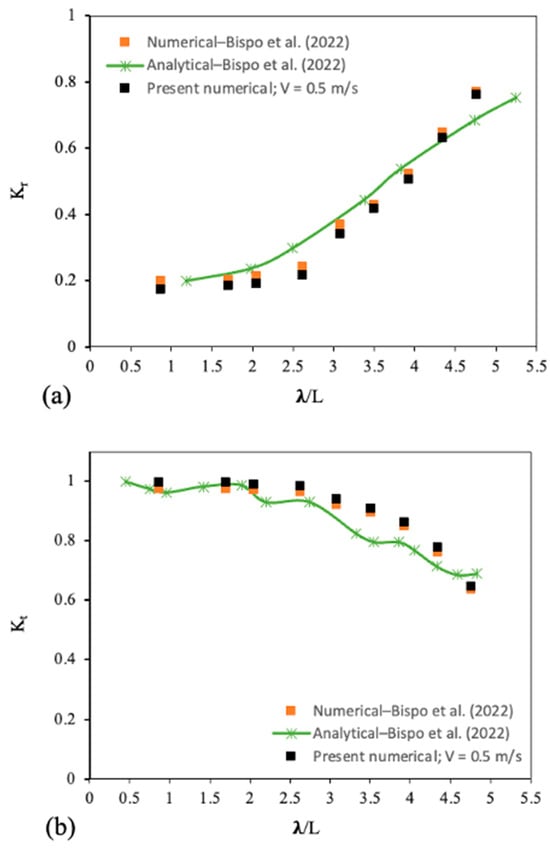 In Figure 7a, when and for the intermediate value of , the numerical result converged to the numerical and analytical model, whilst values are close for some data points. However, at a specific , a discrepancy arises between them. The reason for this is that the existing speed in the upstream area transmits more wave energy that flows over the interconnected and underlying structures, resulting in reduced reflection in the current model. This effect is not observed in the predicted models [44]. Consequently, the present numerical model exhibits a bit higher reflection coefficient compared to the findings of the analytical and numerical models [44].