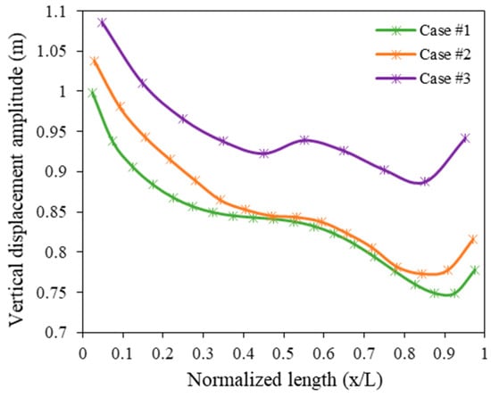 Figure 8 shows a comparison result between the RAO of vertical displacement amplitude of the interconnected structure versus normalized length under different arrangements (see Table 4) with a certain value of wavelength, , subjected to current load with a constant speed of 0.5 m/s. The comparison reveals that the whole system becomes more stable as the number of bodies used in the model and accordingly the total length of the interconnected structure increases. This is likely due to the increased structural integrity, which causes a reduction in the vertical displacement result. Furthermore, the maximum displacement is observed at the first body in all three cases, where in case #3 the displacement is 1.085 m, while the present model is observed at 0.998 m, which is 8.72% higher.