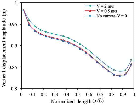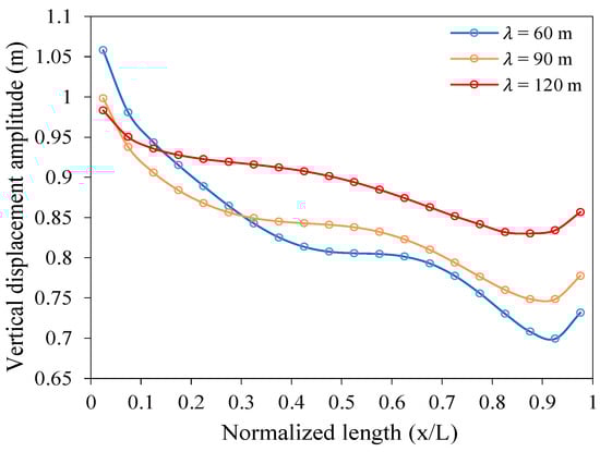 The maximum current speed signifies that the vertical displacement amplitude increases as the length grows. On the other hand, the overall patterns indicate that the amplitude of vertical displacement diminishes as the length increases, and for shorter wavelengths, it declines throughout the entire structure.