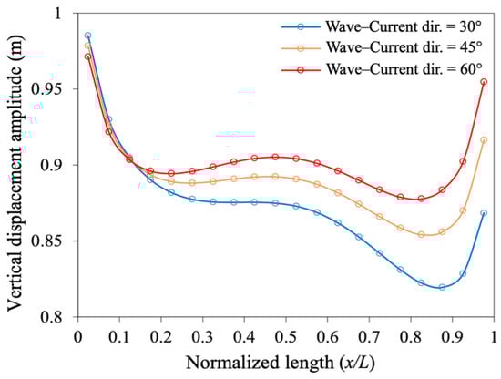 Figure 11 shows that as the length increases, the vertical displacement amplitude decreases and then increases for the last three plates (Plate #17 to #20) in the presence of different wave and current directions. Also, the wave and current direction positively impact the vertical displacement amplitude, particularly at angles of attack between 30° and 60°. Increasing the wave–current direction leads to greater vertical displacement, especially at the middle and last plates, while this is in reverse for the first and second plates. This occurs because when the angle of attack is perpendicular to the floating interconnected structure, the wave force travels along the floating horizontal plate in the x-direction. It can also be stated that since the wave–current direction is at a lower angle, the first plate encounters the wave and has the bigger displacement, and this displacement will dissipate along the other plates when compared to plates #1 and #2. This can be explained by the fact that plate #1 is the first plate connected to the structure and will react not only to the wave but also to the tension in the cable.