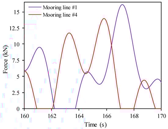 Figure 12 shows the force exerted on two mooring lines (mooring lines #1 and #4) over time. The rapid fluctuation in force on mooring line #1 suggests that it experiences a higher dynamic load than mooring line #4; this could be due to the location of mooring line #1, which is located at fore of the structure attached to the 1st plate rather than mooring line #4 connected to the 20th plate, which experiences less dynamic load and hence less tension in the mooring lines.