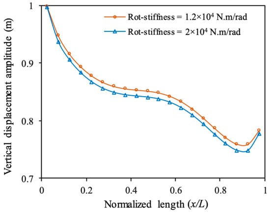Figure 9 demonstrates that as the length increases from plate #1 to plate #20, the vertical displacement amplitude generally decreases in all three cases (V = 0, 0.5, 2 m/s). However, the rate of decrease changes depending on the current speed. The result representing the highest current speed (V = 2 m/s) shows the highest vertical displacement amplitude with increasing length. As currents exert hydrodynamic forces on the floating interconnected structure, results in a higher displacement with certain values of mooring and rotational stiffness.