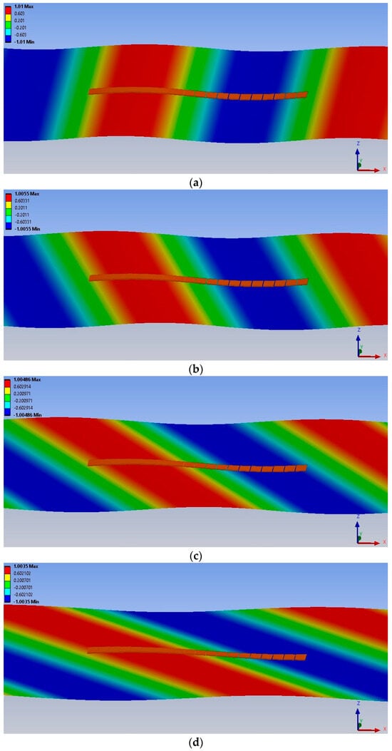Table 5 presents the numerical data (sourced from AQWA) regarding the vertical displacements of individual modules under various wind loads while maintaining . The impact of on the structural displacement is minimal across the different wind loads. It is important to highlight that in AQWA [45], the drag force of the wind is computed based on the at a height of 10 m above the reference point above the waterline. Additionally, the near the still water line (SWL) is quite limited in size; this indicates that the wind loads on the floating foundation near the SWL can be regarded as insignificant [17].