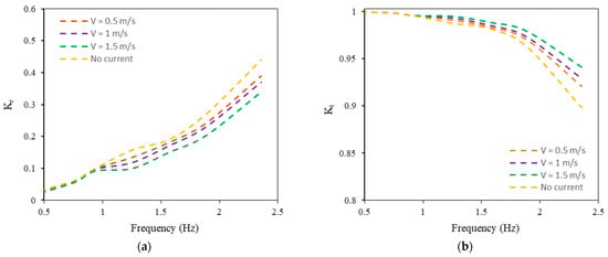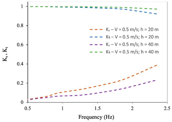 Figure 18 compares the influence of h on and vs. frequency (Hz) with current speed . It shows that diminishes as the depth of water rises and the observation of is reverse to that of . This occurs because an increase in water depth allows for greater transmission of wave energy underneath the large floating interconnected flexible structure, resulting in a reduction in the reflection coefficient in the upstream region and heightened in the downstream region; this is physically justifiable.