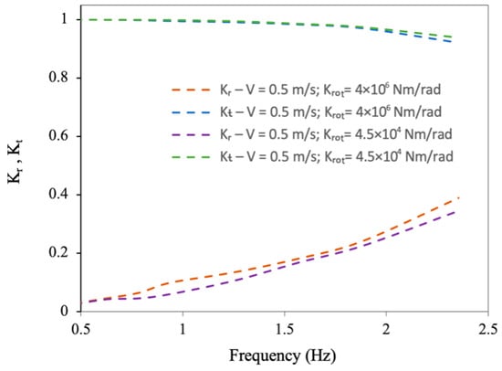 Figure 19 simulates the impact of rotational stiffness on and with current speed vs. frequency (Hz). It is seen that the value of increases with an increase in the values of , whilst the observation is to be reversed in the case of to that of .