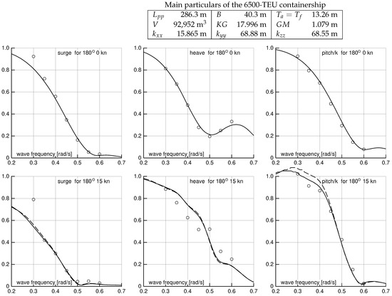 Non-dimensional surge, heave and pitch motion amplitudes of the 6500-TEU containership at zero (top) and 15 kn (bottom) speed according to experiments of Hong [11] and computations using programs Pansteady and Pandfds: Continuous and broken curves using 1177 and 3379, respectively, partly or fully submerged hull panels on starboard side.
