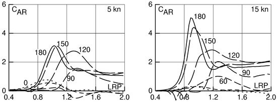 Figure 5 shows the added resistance coefficient of the KVLCC2 tanker as a function of the length ratio parameter LRP for different wave angles. For wave lengths , wave angles 150 and 120 degrees often cause higher added resistance than head waves. The negative peaks in long waves of angles 90, 60 and 30 degrees at 15 knots are caused by roll resonance.