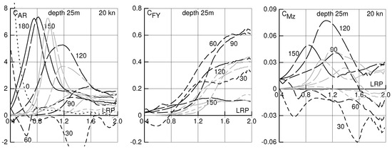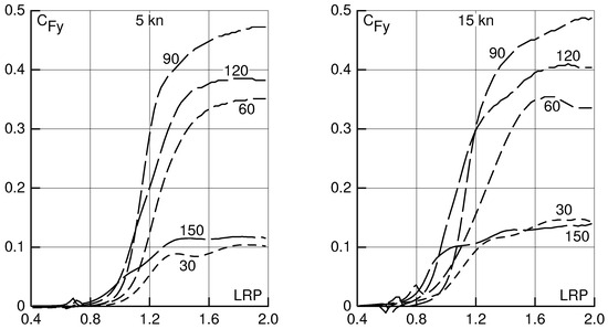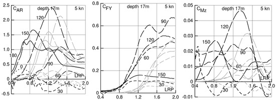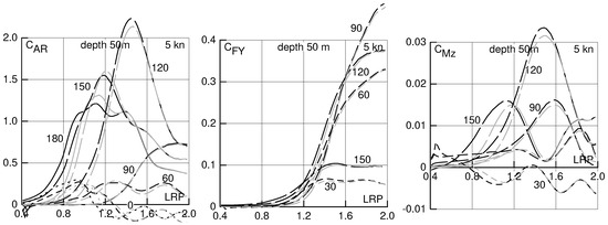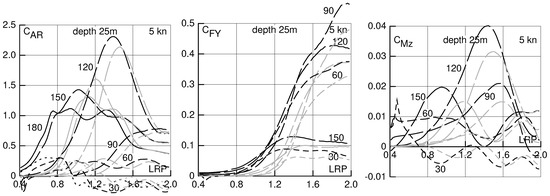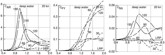 In Figure 11, Figure 12, Figure 13 and Figure 14, results for a speed of 5 kn in deep water and in water of 50 m, 25 m and 17 m depth are shown. This speed may be considered for estimating the danger of insufficient maneuverability in heavy weather near to a shore. In this case, a water depth of 50 m has only small effect on drift force and moment, 25 m depth has a moderate effect, and 17 m depth a large effect, especially on the transverse force and the yaw moment.