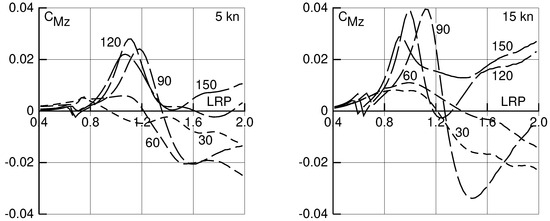 Figure 6 and Figure 7 show the dependence of and , respectively, on wave frequency and direction, again for the KVLCC2 tanker at two different speeds. The maximum of the transverse force occurs for waves from the side. The yaw drift moment changes sign depending on wave length for most of the wave angles. Again, spikes at low frequencies are caused by resonant roll motion. To illustrate the effect of higher Froude numbers for a slender ship, Figure 8 shows the drift force and moment coefficients for the 6500-TEU containership at 20 knots speed. The spikes at high frequencies, especially for the wave angle 90 degrees, are caused by deficiencies of the numerical method.