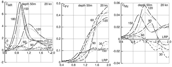 Figure 9 and Figure 10 illustrate the coefficients of added resistance, transverse force and yaw moment for water depths of 50 m and 25 m, respectively. Generally, positive drift forces and moments are larger and negative ones are smaller (more negative) in shallow water than in deep water. The main reason for that is because in shallow water waves, amplitudes of horizontal velocities in the direction of wave propagation are larger than those in vertical direction by the factor . Thus, for constant wave amplitude and frequency, horizontal velocities increase if the water depth decreases. For estimating the ship’s ability to proceed and turn in waves, shallow water is decisive if is substantially smaller than 1. In the present case, the effect is moderate for 50 m and large for 25 m water depth.