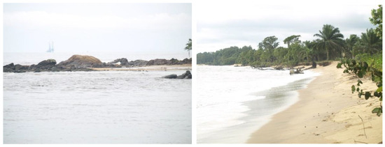 They are rough and show two large morphological elements. The rocky volcanic cliffs are located on the outskirts of Mount Cameroon and stretch about 60 km from Bimbia to Idenau. The volcanic rocks that crash it are from Mount Cameroon, and the volcanic activity is responsible for the presence of some moles that emerge over the ocean in Limbe. This feature that breaks the monotony or the low profile of the coastal regions is characterized by the presence of bays, capes (Cape Limboh), cliffs, and rocky islands (Figure 4). The second morphological unit consists of rocky shores with narrow beaches that run from Kribi to Campo for nearly 80 km. These beaches were shaped on crystalline schist fragmenting into large blocks. These shales give a particular aspect to the coastal landscape of Kribi, famous for its sandy beaches (Figure 5).