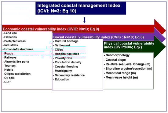 To assess coastal vulnerability, there are many ways depending on which factors/indicators we privilege. Numerous studies have examined the coastal vulnerability index from Gornitz et al. [43]. They were the first to create it and use eight parameters to figure out how vulnerable a coastal area is to expected SLR. These parameters are relief, rock type, landform, vertical movement, shoreline displacement, tidal range, and wave height. But nowadays so many recent studies [44,45,46,47,48,49,50,51,52] stressed the fact that we cannot assess CVI without taking into account social and economic or socioeconomic parameters. In order to achieve this goal, we selected the multi-scale coastal vulnerability index. Our efforts resulted in the division of the Cameroon coastal area into five distinct zones, each corresponding to the dominant physical features. This process also facilitated the creation of numerous indicators, enabling us to calculate the CVI physical index, CVI social index, and CVI economic index (see Figure 6). We added the three indices together to obtain a single index of coastal vulnerability along the coast of Cameroon. Figure 6 illustrates this, along with the primary equations utilized to compute the three indices.