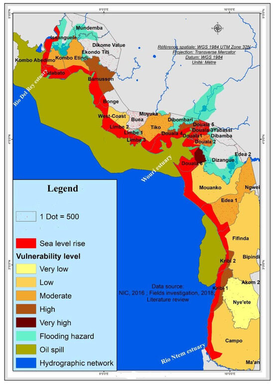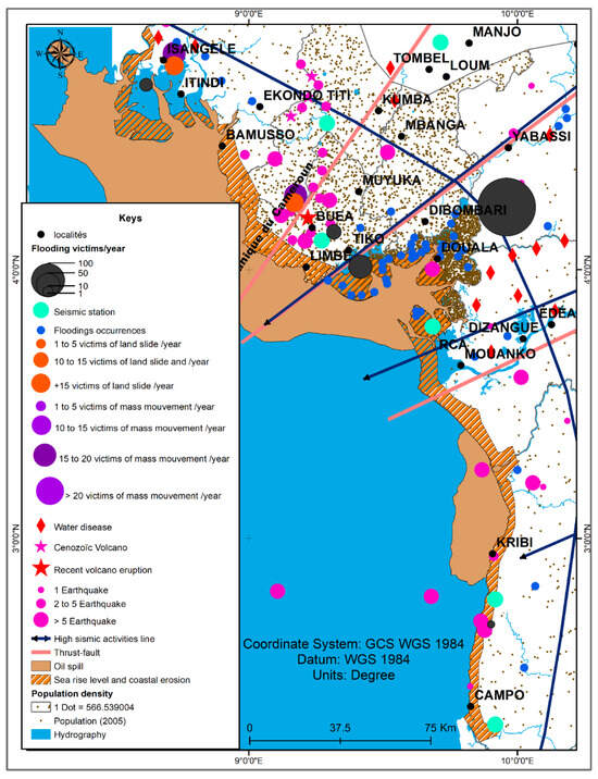 The history of natural hazards dates back to the beginning of human existence. However, their strong recurrence in the final decades of the 20th century is worthy of particular attention, as such disasters have occurred in all scientific environments and countries. The interest of the international community in natural hazards and their consequences is, therefore, growing, and it will continue to increase despite the many decades of work devoted to them by the United Nations and efforts across all the continents to control them. Coastal urban centers account for over 70% of Cameroon’s GDP, with Douala contributing a significant share, and they represent a strong concentration of residential, industrial, commercial, educational, and military facilities [1]. Also, coastal cities are locations with high levels of economic activity, mainly because of their associations with ports and waterfront development and their well-endowed coastal and marine environments [2]. Such conditions contribute to the creation of risks and high levels of exposure to hazards, mainly floods. The population in the “near-coastal zone” (defined as areas within both 100 m elevation and 100 km distance from the coast) was evaluated in 2023 by Cosby et al. [3]. The authors found that the population was significantly concentrated in this zone (approximately 2 billion within 50 km and 1 billion within 10 km along the coast), with higher growth rates, estimated at 463 million within 50 km and 233 million within 10 km. These authors also showed that Africa had the second-largest near-coastal population, with 256.2 million coastal inhabitants. This number represents 11.6% of the global coastal population. Moreover, according to Reimann [4], nearly half of the world’s population lives in coastal areas, and coastal hazards exhibit severe impacts due to the high concentration of people and assets in exposed locations. Coastal areas are particularly subject to multiple hazards, particularly those related to shoreline mobility (evolution of beaches, dunes, and receding cliffs) and sea level rise [5].