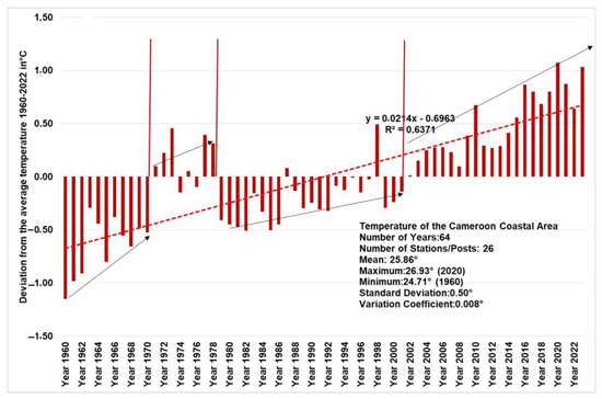 Average temperatures are relatively stable and oscillate between 25 and 27 °C, while the relative humidity is maintained at values higher than 80% practically all the year. The coastal agroecological zone with single-mode rainfall is marked by a weighting of average temperatures related to the mountain fact despite a significant increase and marked differences by decade. Stressing on temperatures, Cameroon Second Communication on climate change as well as NAPCC [38,39] describe three main periods: a period of low temperatures (1961–1969), one of average temperatures (1970–2002), and one of high temperatures (2003–2010). These reports concluded that with a 1.3° increase per decade, the temperature in the coastal agroecological zone has increased by 5% per decade.