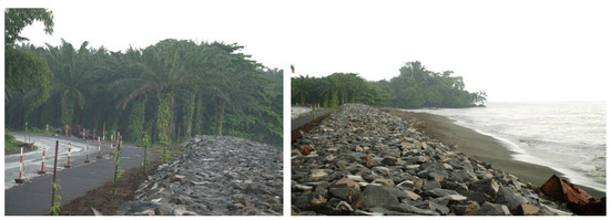 In Gabon, Central Africa, Ovono [29], using geomatics tools, analyzed coastal erosion on Gabonese coasts. In Cameroon, the World Disaster Report [30] finds that between 2005 and 2014, 96,867 people were affected by natural hazards and 717 lost their lives. Mbevo [31] highlights the occurrence of dramatic urban floods in the city of Douala. He also reports on situations of intense coastal erosion in the island of Manoka (Cap Cameroon) with 30 m of shoreline retreat between 1992 and 2015.