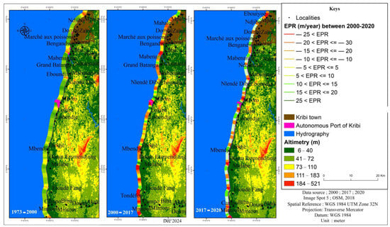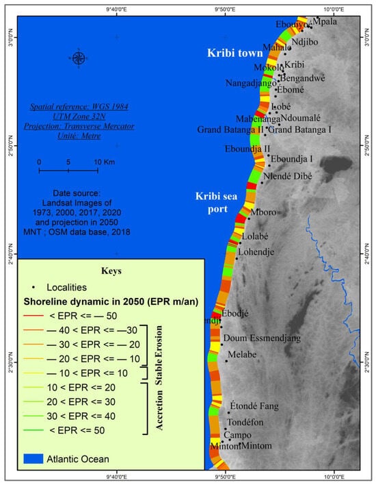 The measurement of the dynamics of the coastline has been carried out by using Landsat satellite images from 1973 to 2020 (Table A1). Coastal erosion mapping is based on the Digital Shorline Analysis System (DSAS) model developed by Thieler et al. [53]. The DSAS version 4.3 tool developed by USGS is an extension of the ArcGIS 10.5 software. It makes it possible to evaluate the evolution of the coastline. We used the 1973 shoreline to create the Baseline. Since it is moving due to the tide, we generated a 5 m Buffer around the 1973 line. Once established, the Buffer is transformed into a “polyline”. This is then exported to the “geodatabase”. Then, the land-oriented edges of this Buffer (for the movements of the offshore lines) and the sea-oriented edge (for the movements of the offshore lines) are extracted. This baseline plays an important role in calculation operations in DSAS. In the third step, orthogonal transects are generated at a specified spacing along the coast using DSAS when the “Personal geodatabase” is ready in ArcGIS. They are generated automatically by DSAS [54]. A total of 5828 orthogonal transects are generated across the entire Wouri estuary, and 962 at Kribi. The spacing between transects is 100 m. The length of each transect is 1100 m. The mean coefficient of determination is the average of all the coefficients of determination at each transect. The uncertainties in the annual rate of change in meters per year are the 95% confidence intervals (LCI95 or WCI95). As statistics are concerned, DSAS uses several statistical techniques comparing coastline positions over time to estimate the evolution of the coastline [54]. The main methods used in DSAS for this study are described below. In the last step, after creating the orthogonal transects, DSAS calculates the global changes in the coastline positions. The annual rate of changes in the coastline is calculated for each period using the end point rate (EPR) method, and the coefficient of determination (R2) is calculated by DSAS. The end point rate method is the distance on the transect between the two most recent and oldest coastlines divided by the number of years separating them [54] and rendered by the following equation: