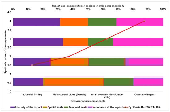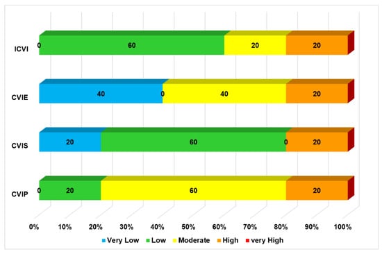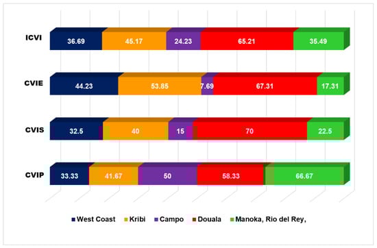 Table 6 classifies CVI variables as dimensionless “risk” variables, ranging from 1 to 5. We used 5−1 (4) percentiles as limits. We multiplied 4 by the total number of variables (n) for each sub-index, i.e., 24 for the physical CVI, 40 for the social CVI, and 52 for the economic CVI. After calculation, we tried to rank each type of sub-index and the final coastal integrated vulnerability index in percentage in order to build graphics from Excel 2016 as well as maps of vulnerability in the whole Cameroon coast. Two main Excel graphs were found. The first showed a “risk” variable that ranged from 1 to 5 based on the levels of vulnerability and was calculated as a colored percentage. The second showed the physical coastal features, which are what determines the risk (Table 6).