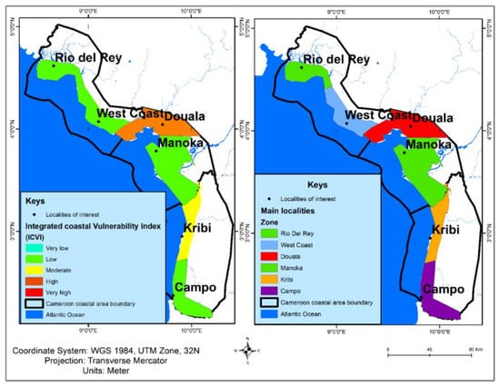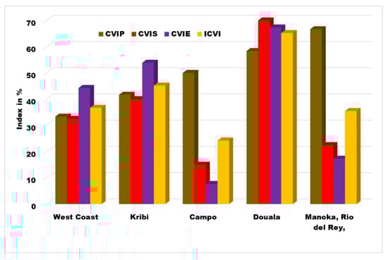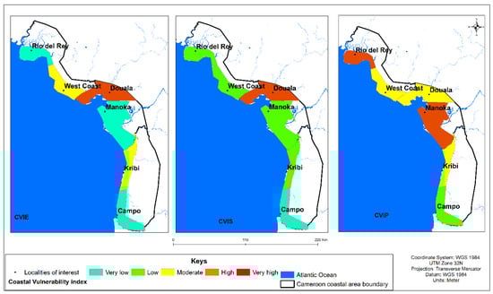 We performed the vulnerability mapping using data collected in the field, extracted from fieldwork (2007–2020), geoinformation, and data from the literature review. From a cartographic point of view, we superimposed the different layers of information in the Armap 10.5® software. Finally, to illustrate the finding, we use Excel 2016 to compute statistics with graphs of the CVI, ArcGIS 10.5, and ArcMap 10.5 to draw the vulnerability maps index of the whole Cameroon coast and to make the necessary projection. Due to some constraints (length of the paper) and because it has been previously published [57], only some sketches of the Kribi shoreline are presented in the results. Figure A2 in the Appendix A summaries the methodology chart.