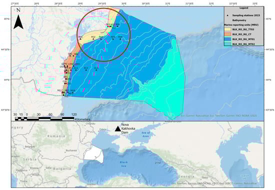 An oceanographic cruise was carried out from 6 to 11 June 2023 along the Romanian Black Sea coast, within three marine reporting units (MRU)—transitional (TT03), coastal (CT) and marine (MT01)—with bottom depth stations between 6 m and 57 m (Figure 1).