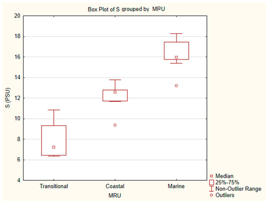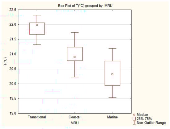 The surface temperature ranged from 19.53 °C to 22.32 °C (Table S1). A temperature gradient was shaped from north to south and from coast to shelf. Thus, in transitional waters, the temperature was the highest, with a relatively small range of variability. The coastal region had slightly lower temperatures than the transitional region, with a moderate range, while marine waters were measured with the lowest temperatures and the greatest variation, possibly due to less uniformity in sea conditions compared to nearshore environments (Figure 2).