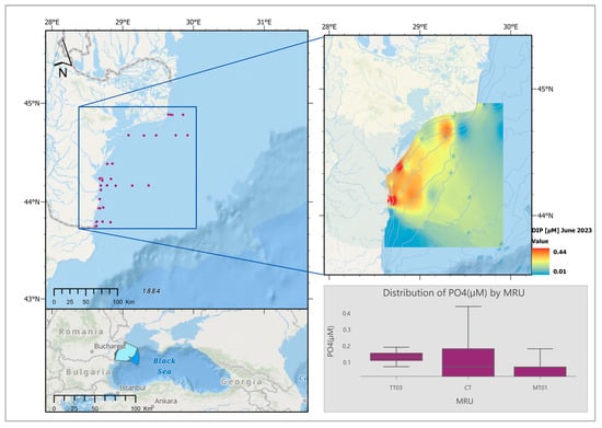 Spatial distribution of dissolved inorganic phosphorus (DIP) and box plot by marine reporting units, surface of the Black Sea, June 2023.