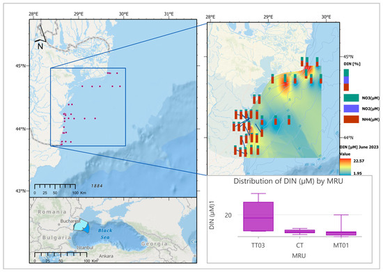 Spatial distribution of dissolved inorganic nitrogen and box plot by marine reporting units, surface of the Black Sea, June 2023.