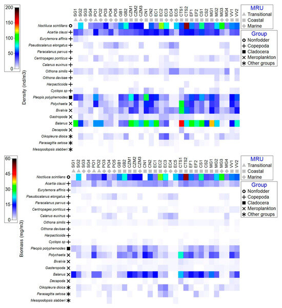 The shade plot displays the spatial distribution of mesozooplankton taxa in terms of density (ind/m3) and biomass (mg/m3) across transitional, coastal, and marine reporting units (MRUs). The taxa, categorized into functional groups (e.g., copepods, meroplankton, and nonfodder component—represented by N. scintillans), showed varying abundances across these environments. Taxa density (individuals/m3) showed the highest values for N. scintillans and Balanus (Cirripedia larvae) at certain coastal and marine stations, reaching up to 200 individuals/m3. Biomass (mg/m3) followed a similar distribution pattern but with lower overall values, peaking at 60 mg/m3 (Figure 8).