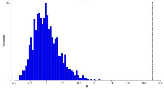 Histogram representing the distribution of the test statistic R from the MRU test.