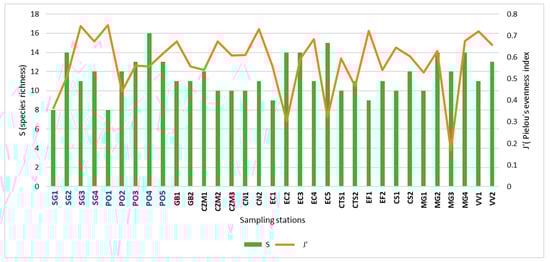 Species richness (S) and evenness (J′) across sampling stations, blue stations represent flooded sampling sites, June 2023.