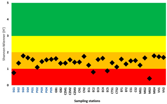 Shannon–Wiener legislation of the aquatic environment classifies water quality as >4 = very good quality, 3–4 = good quality, 2–3 = moderate quality, 1–2 = poor quality, and <1 = very poor quality [32]. Most of the sampling stations in June recorded low index values within 1–2, implying poor quality, with some stations having very poor quality, indicating low biodiversity (Figure 11).