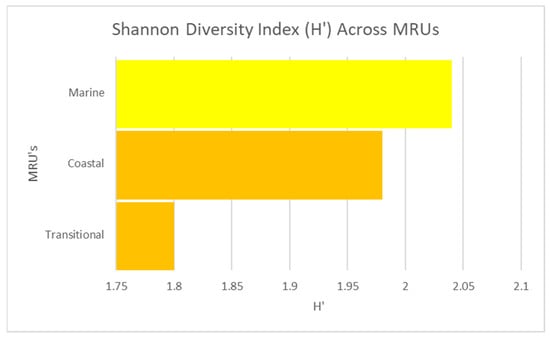 Transitional, coastal, and marine waters exhibited varying levels of biodiversity, as indicated by the Shannon diversity index (H′). Transitional waters showed the lowest H′ value (1.8, orange) and were classified as poor quality, likely due to environmental stressors such as pollution or freshwater inputs. Coastal waters had a slightly higher H′ value (1.98, orange), reflecting a mix of influences from both transitional and marine zones but were still classified as poor quality. Marine waters displayed the highest H′ value (2.04, yellow), indicating moderate ecological quality, with more stable conditions (Figure 12).