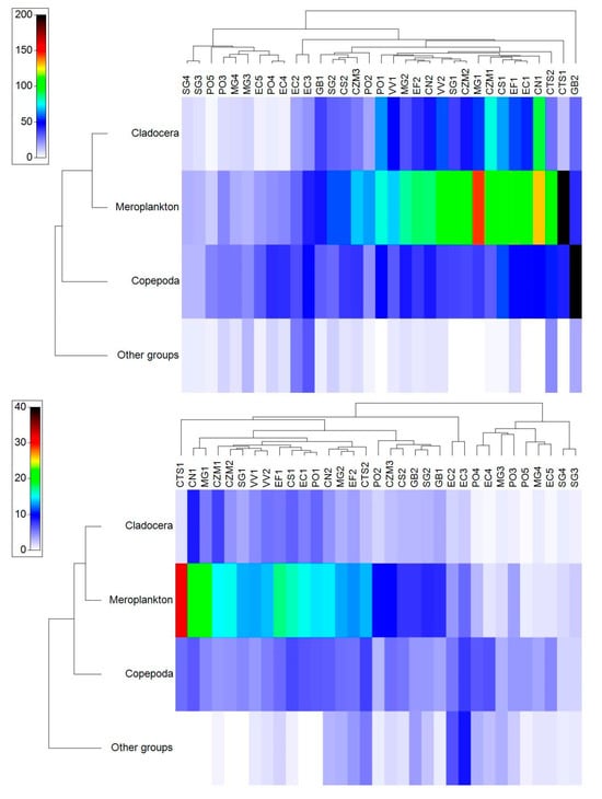 The heatmap analysis demonstrated distinct patterns in the density and biomass distribution of fodder zooplankton groups across sampling stations. Meroplankton ex-hibited prominent peaks in density and biomass in specific sampling sites while Copepoda maintained consistent moderate density and biomass (Figure 14). The Cladocera group showed moderate density and a contribution to biomass, influenced by Pleopis polyphemoides relatively larger size; however, its overall impact appears less prominent compared to meroplankton. In contrast, Other groups consistently show low density and biomass, indicating a limited role in community structure. The clustering patterns in the heatmaps reveal spatial or temporal trends, with meroplankton dominating localized hotspots, while Copepoda and Cladocera exhibited broader, more stable distributions (Figure 14).