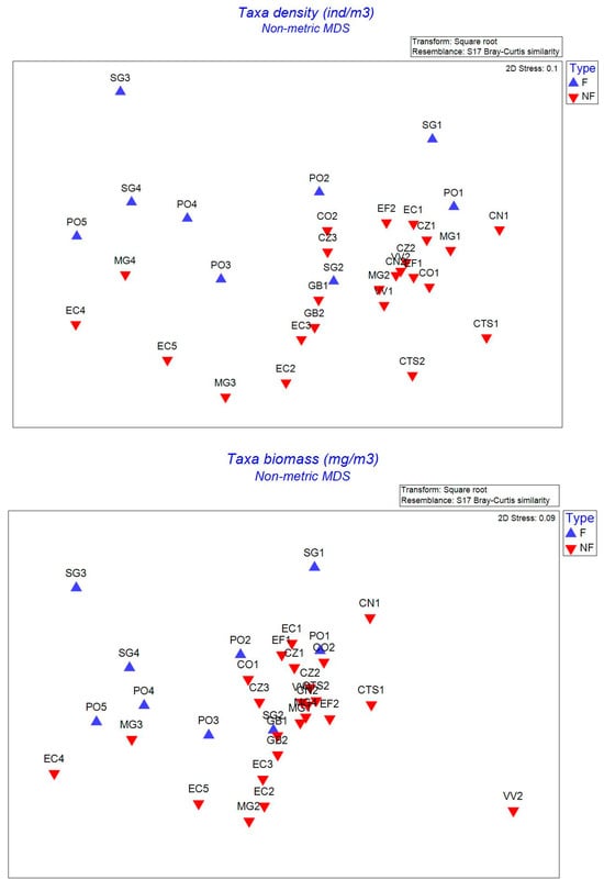 Non-metric multidimensional scaling (nMDS) plots were used to assess the similarities in taxa density (ind/m3) and taxa biomass (mg/m3) between flooded (F) and non-flooded (NF) stations. This technique visually represents the relative dissimilarities in community composition based on the selected metrics, allowing for a comparison of the ecological patterns between the two station types.