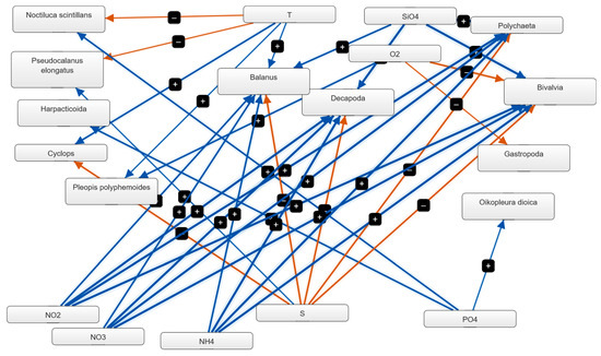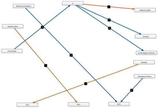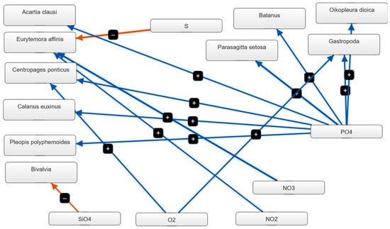 Semi-quantitative modeling was conducted using open-source Mental Modeler software (https://www.mentalmodeler.com/) [33] (accessed on 30 October 2024), with significant correlation coefficients indicating the strength of linkages between components. Fuzzy cognitive mapping (FCM) generated qualitative static models [34], which were later converted into quantitative dynamic models. A correlation analysis was performed to evaluate the relationships between mesozooplankton species across marine reporting units and environmental factors, including temperature, salinity, oxygen, and nutrients (phosphate, silicate, nitrite, nitrate, and ammonium). Statistical significance was assessed at a threshold of p < 0.05, identifying the environmental gradients that influence species distributions and responses to changing conditions. This approach captured system knowledge by defining three key attributes: the system components (mesozooplankton and abiotic parameters), the positive or negative relationships between them, and the degree of influence one component has over another [12,34,35]. These influences were categorized qualitatively as high, medium, or low, based on significant (p < 0.05) Pearson correlation coefficients. Pearson correlation coefficients between physicochemical parameters and mesozooplanktonic species were input into Mental Modeler using data from marine reporting units to build the model [12,34,35]. Positive correlations were visualized with blue arrows and negative correlations with orange arrows, with the weightings reflecting the corresponding coefficient values [12,34,35].