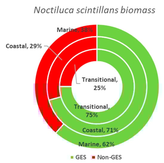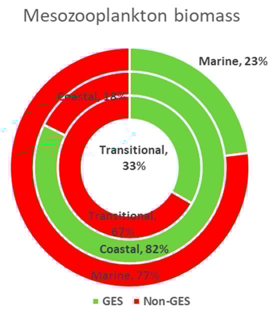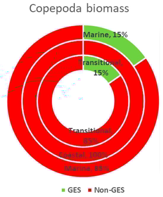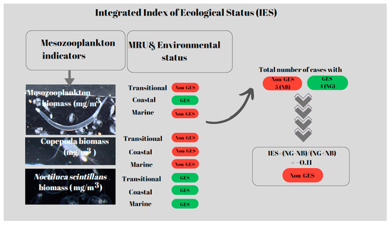 The integrated Index of Ecological Status (IES) [36] was calculated based on the three mesozooplankton indicators, assessed across the three MRUs. Each indicator in each zone was classified as either achieving GES (good environmental status) or Non-GES, following established ecological assessment criteria. The counts of GES (NG) and Non-GES (NB) cases were tallied to quantify the ecological status across the zones.