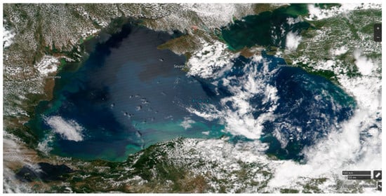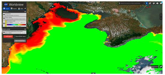 NASA’s high-resolution satellite imagery [37], sourced from sensors such as MODIS and VIIRS, was used to monitor environmental changes in marine ecosystems, focusing on the Black Sea. Data were acquired from NASA’s Earthdata platform [37], with images filtered by location and time to capture the specific event and key environmental parameters such as chlorophyll-a concentrations. These high-resolution images offer a comprehensive view of oceans, seas, and coastlines, allowing scientists to track real-time water quality, sediment movement, and ecological disturbances. With advanced sensors, NASA satellites can detect events such as algal blooms, pollution spread, and the impacts of natural disasters like floods or dam breaches. These data are essential for evaluating environmental impacts, guiding disaster response, and supporting conservation efforts in sensitive areas like the Black Sea.