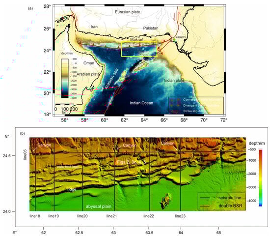 (a) Spatial distribution of the Makran accretionary wedge. The structural elements are compiled from [20]; (b) The location of the seismic profiles available for this study, the red segment represents the location of the double BSR studied.
