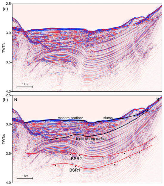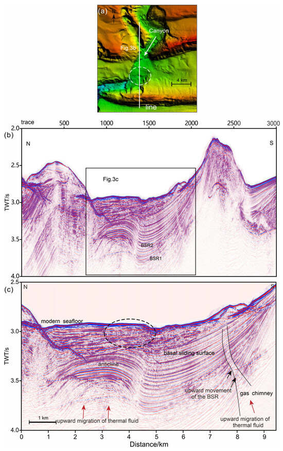The entire fullstack seismic profile used to model the double BSR is shown in Figure 3b. The region exhibits east–west ridges and north–south canyons along the continental slope. The numerous amphitheater-shaped head scarps along the incision west of the canyon indicate that a mega-slump caused the long N–S-oriented straight depression with a “blind” northern end. The seismic profile passes through the intersection of the sediment channels, highlighted by the white dashed circle in Figure 3a.