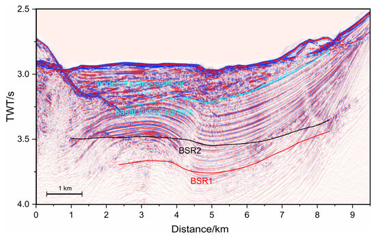 Double BSRs are important to interpret and model as they are not only a reflection of the dynamic changes in the gas hydrate system [4] but also of great significance for studying the characteristics of the gas hydrate system during its evolution in time [14]. Due to the large uncertainties associated with past climate change and tectonic history modeling, the formation mechanism of double BSRs is not well understood and in some cases controversial [4]. Originally, researchers agreed with both the “residue theory” and “multiple gas source components theory” [8,13]. In recent decades, with the continuous investigation and research, a large number of studies have revealed that the occurrences of double BSRs include, but are not limited to, the following three aspects: (1) changes in temperature and pressure conditions (e.g., climate change, tectonic activities) [12,15]; (2) differences in gas source components of natural gas hydrates [8,13]; (3) changes in formation lithology or minerals [3,16,17,18,19].