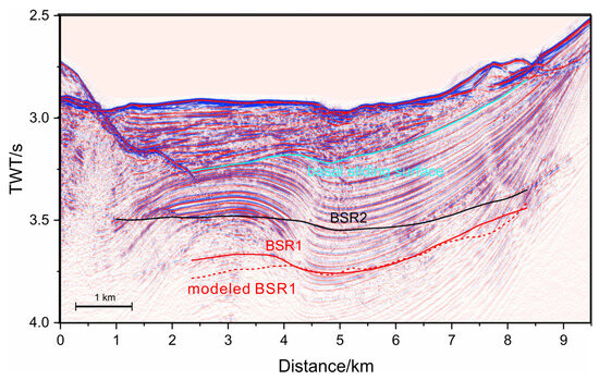The work presented herein focuses on seismic profile 21, which was acquired along the north–south direction in the perpendicular direction of the Makran accretionary wedge (Figure 2). We assume that the geothermal gradient does not change considerably along the seismic profile, and we fitted a geothermal gradient to the modern seafloor to simulate the related parameters of the double BSR. The modeling procedure followed this sequence of steps: