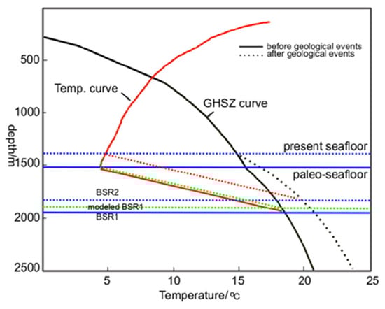 Double BSRs are important to interpret and model as they are not only a reflection of the dynamic changes in the gas hydrate system [4] but also of great significance for studying the characteristics of the gas hydrate system during its evolution in time [14]. Due to the large uncertainties associated with past climate change and tectonic history modeling, the formation mechanism of double BSRs is not well understood and in some cases controversial [4]. Originally, researchers agreed with both the “residue theory” and “multiple gas source components theory” [8,13]. In recent decades, with the continuous investigation and research, a large number of studies have revealed that the occurrences of double BSRs include, but are not limited to, the following three aspects: (1) changes in temperature and pressure conditions (e.g., climate change, tectonic activities) [12,15]; (2) differences in gas source components of natural gas hydrates [8,13]; (3) changes in formation lithology or minerals [3,16,17,18,19].