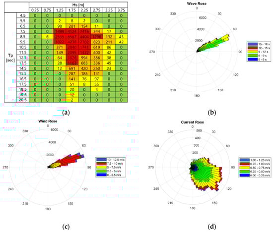 Wave scatter diagram, where numbers in the diagram are occurrence (a), wave rose (b), wind rose (c), and current rose values (d) (longitude: −56 degrees E; latitude: 10 degrees N; it is from this direction that waves, winds, and currents are coming, and all directions are measured clockwise from the north).