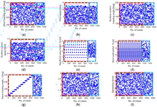 Training (red box) and test (blue box) datasets for environmental conditions ((a): wind speed; (b): wind direction; (c): current speed; (d): current direction; (e): significant wave height; (f): peak period; (g): wave direction; (h): enhancement parameter; (i): spreading factor).