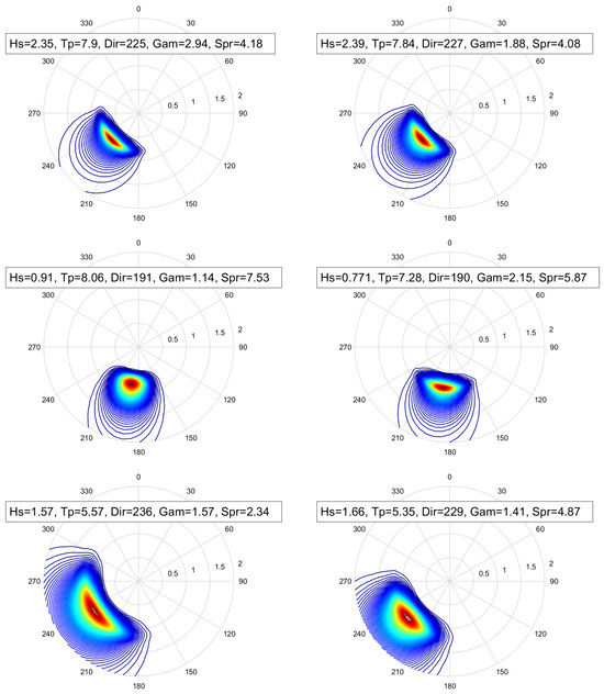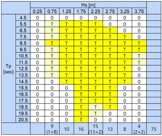 For training datasets, based on the wave scatter diagram shown in Figure 4, 75 typical combinations of and were selected. In addition, twelve wave directions were considered within the range of the measured wave direction. Therefore, nine hundred simulation examples in total were used for training purposes (i.e., 75 wave conditions times 12 wave directions). Additionally, the enhancement parameter and the spreading factor were randomly chosen within the ranges of 1–3 and 2–8, respectively. The surface current/wind velocities were randomly assigned from the minimal and maximal values measured during the observation time. The corresponding wind/current directions were randomly assigned within the range of measurements. Next, a total of three hundred wave, wind, and current conditions were taken into account as the test datasets; each condition was randomly chosen within the respective training dataset’s range, as shown in the blue box in Figure 3.