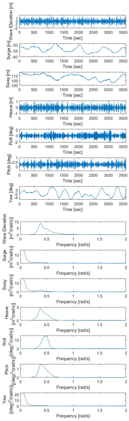 Time series and spectra of wave elevation and 6DOF motion displacements.
