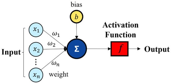 The inverse estimation of incoming waves from motion measurements is a typical inverse problem, for which there exists no unique solution. Also, it is impossible to directly (or theoretically) solve the relevant physics. In this regard, we employed the ANN method to solve this problem. The Kalman filter can also be used to solve the inverse problem with a proper physics model [26,27], while ANNs other than PINNs (physics-informed NNs) do not need any physics model. While an ANN can effectively approximate the nonlinear relationship between motion signals and wave parameters, its limitations include the requirement of a large, high-quality training dataset, potential overfitting, and a lack of direct physical interpretability. An ANN is a mathematical model designed to mimic an organism’s ability to learn and understand the correlation between input and output without explicit relational expressions. They comprise an input layer for receiving data, an output layer for producing results, and one or more hidden layers connecting them. Each layer comprises a certain number of nodes. In ANNs, learning involves determining the weights and biases in each layer to minimize the disparity between the final estimated output value by ML and the actual value. The learning process mechanism is illustrated in Figure 6. It earns the term “feedforward” because it traverses through an intermediate layer housing the activation function as it progresses from the input nodes to the ultimate output . Initially, the weights , input , and bias assess the weighted sum of inputs . To better include the nonlinear relationship between inputs and outputs, the activation function is subsequently included to determine whether external connections perceive this neuron as activated or not. The network eventually generates the predicted value , while the network error is calculated as the difference between the correct output and the predicted value .